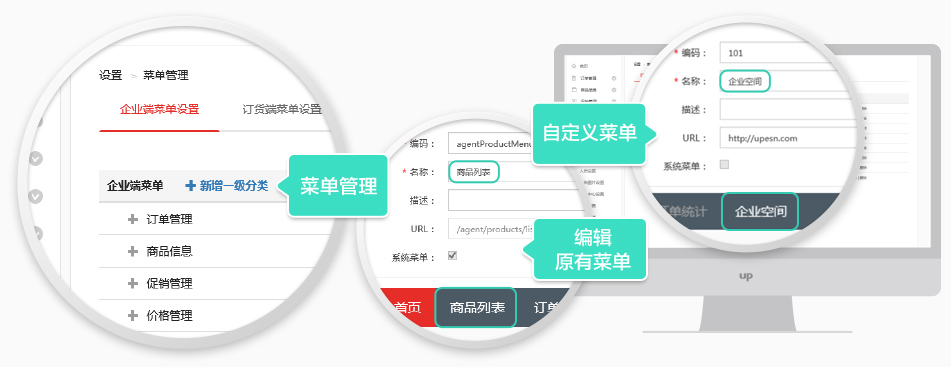 比如U訂貨默認菜單為商品信息,當企業有很明顯的行業特征時,可能稱為產品、服務,甚至設備、五金工具等等使得電商平臺更具行業性、企業化。當企業習慣了老系統的菜單擺布及叫法時,也希望新上線的系統和老系統一致而使員工更快的適應新系統。